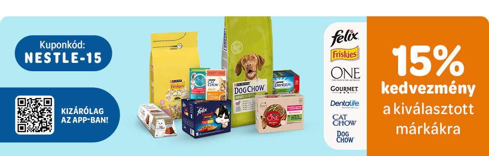 Csapjon le gyorsan a 15% kedvezményre* amit most a Felix, Friskies, Purina ONE, Gourmet, Dentalife, Cat és Dog Chow kutya- és macskaeledelekre ajánlunk.