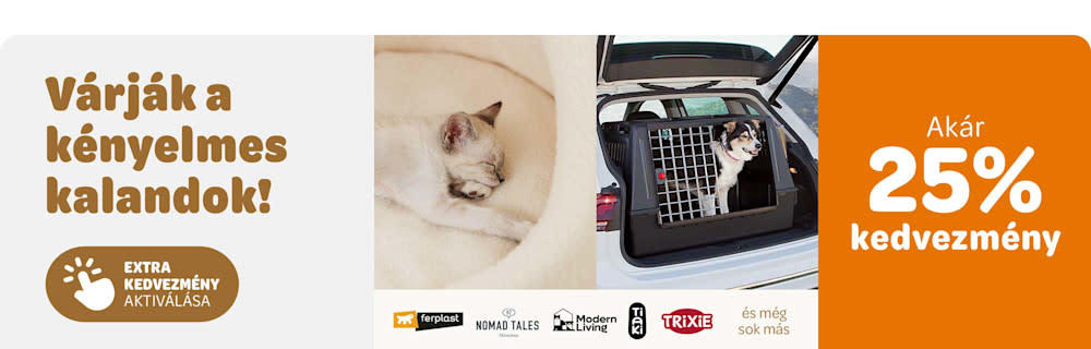 *Az ajánlat 2026.05.05., 23:59-ig érvényes a TIAKI, Modern Living, Nomad Tales, zooplus Exclusive, zooplus Basics, Ferplast, Savic, Heim, Kerbl, Hunter, Kleinmetall, Lionto, Vetbed, Aumüller, Flamingo, Zolux, Catit, Eyenimal, Petkit, Trixie, Karlie, Curver, Pawz&Pepper, beeztees és Petlando márkák kiválasztott termékeire. A kedvezmény aktiválásához kattintson az "Extra kedvezmény" jelölőnégyzetre.