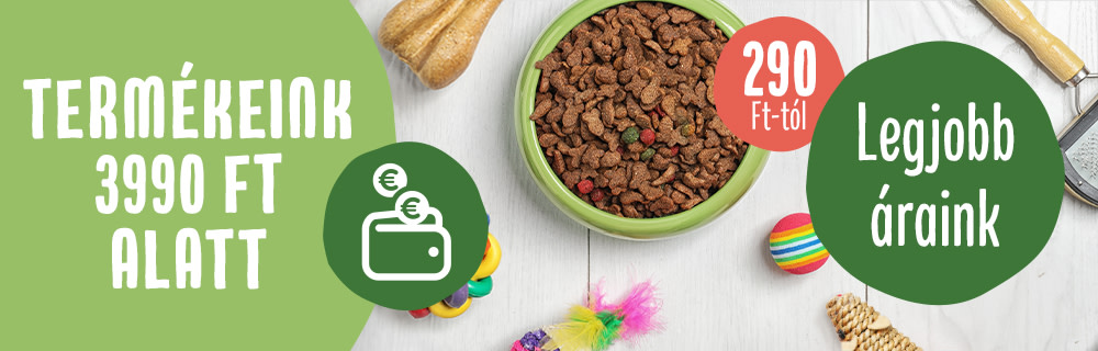 Fedezze fel szuper termékeinket, amelyek mindegyike 3.990 Ft alatt ajánl eledeleket és snackeket kutyájának, cicájának, madarának vagy rágcsálójának.