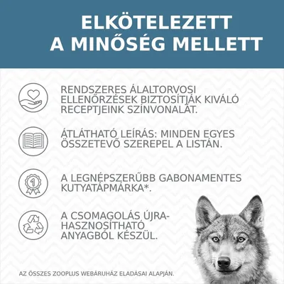 - 100% gabonamentes receptúra: gabonaérzékeny kutyák számára is alkalmas